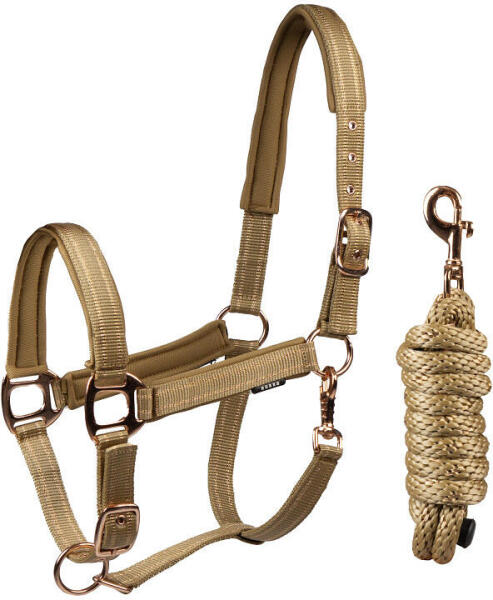 Luxe tweekleurige halsterset, verstelbaar bij zowel kopstuk als neusriem en inclusief 200 cm halstertouw met karabijnhaak