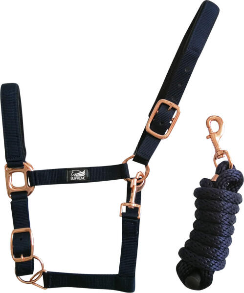 Fedezze fel a prémium nylon Supreme lovaknak készült kantárt, neoprén megerősítéssel és rózsaszín arany króm csattal. Tökéletes a lovak számára.