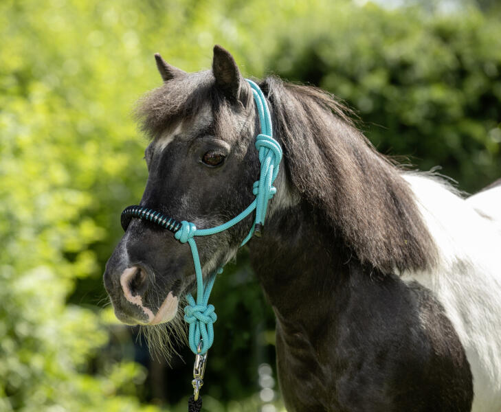 Csomózott kötőfék orrnál fonott díszítéssel. Ideális lovak képzéséhez, szabadidomításhoz.
